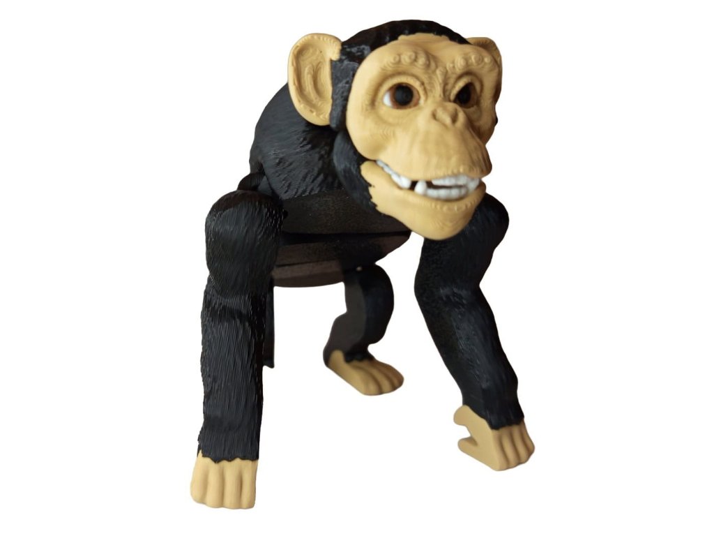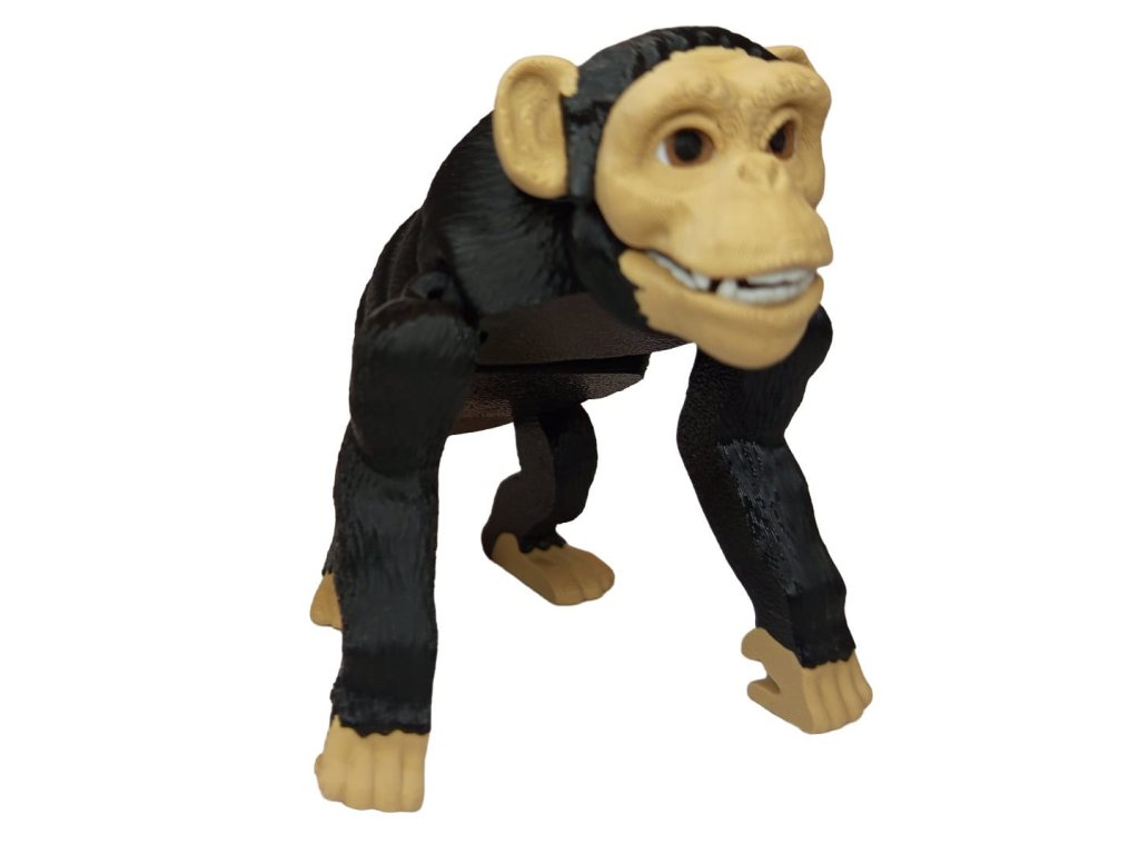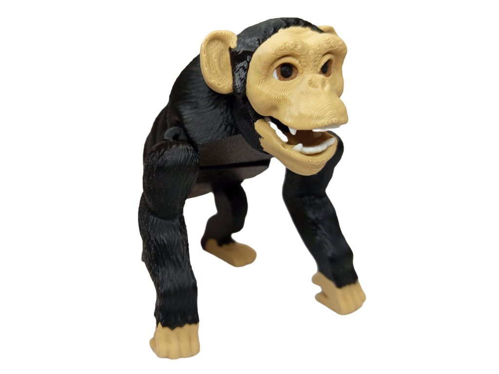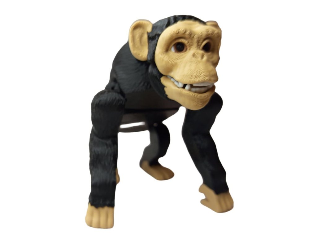 Perfektně barevný, barvy nejsou naneseny povrchově, barevnost šimpanze jsme docílili tím, že ho vyrábíme ze 4 materiálů na jednou. Proto je barevný do hloubky a s vysokou přesností.